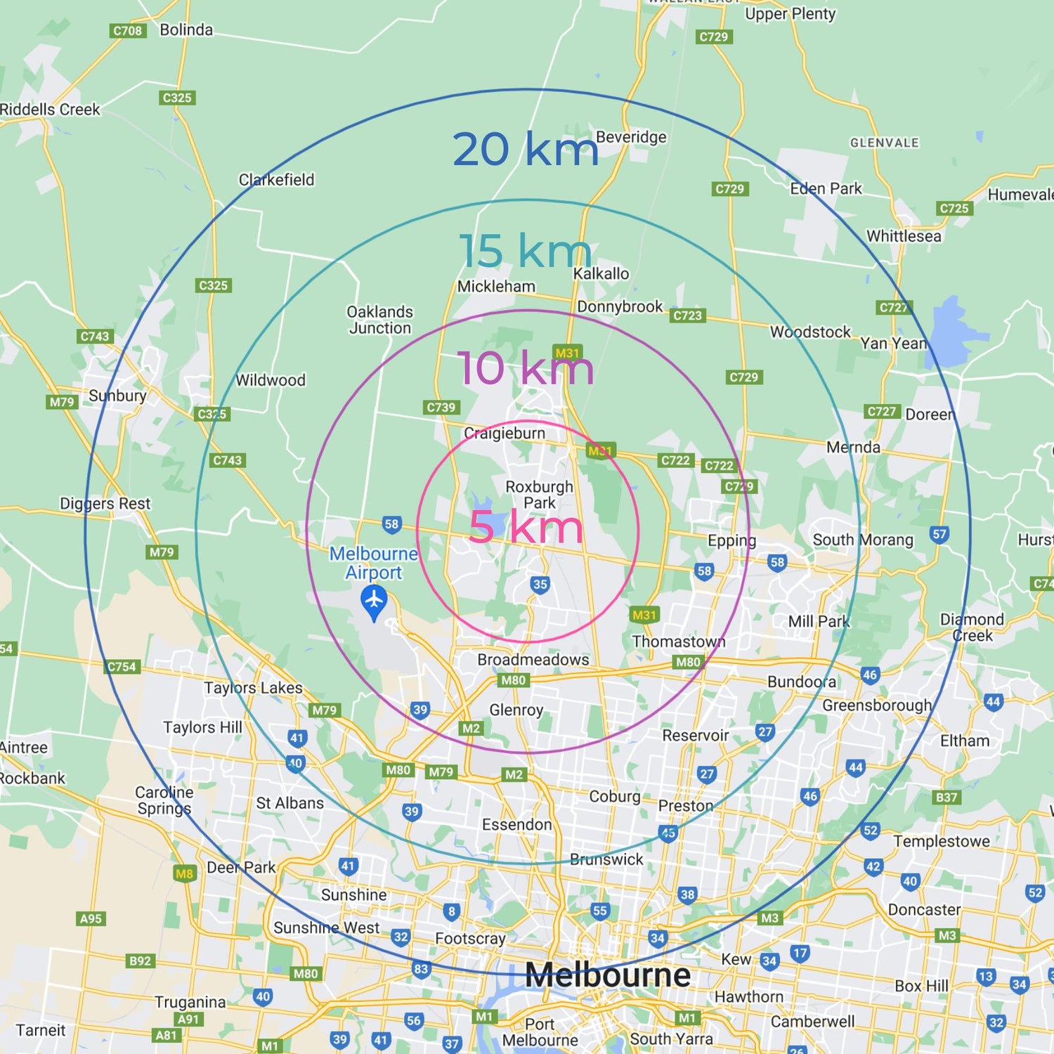 This map illustrates the approximate delivery radius for our flower deliveries across Melbourne. Please note that this map is for reference purposes only, and the actual delivery cost will be calculated during the checkout process.