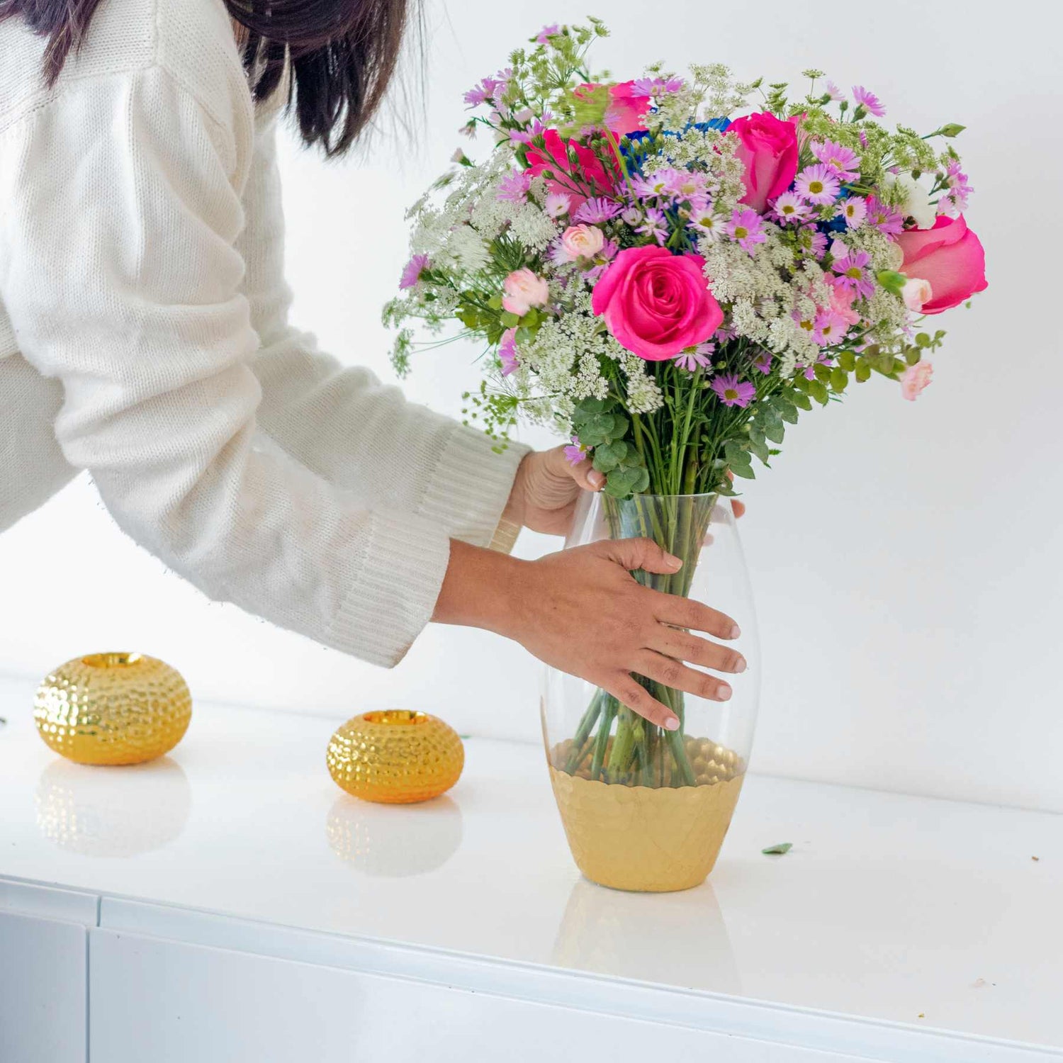 Display your flowers! This might be the trickiest part – finding the perfect spot to showcase your beautiful flower arrangement. Flowers will last significantly longer when kept away from direct sunlight, heat, drafts, and ripe fruit or vegetables. These factors can either damage the flowers or cause them to age faster.