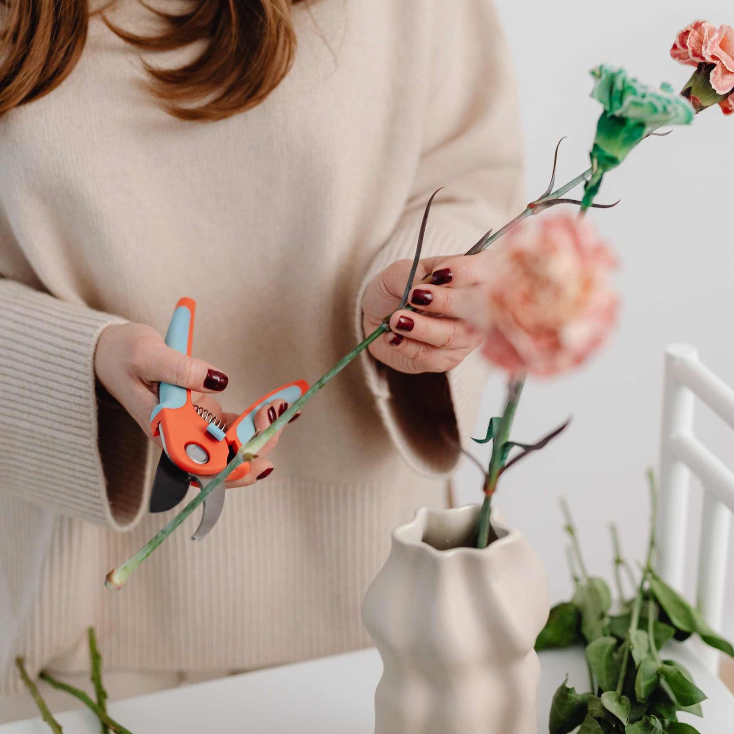 If your flowers have been out for a while, give them a fresh cut before placing them in a vase. Feel free to rearrange them as desired or leave them tied up in our signature front-facing design. Ideally, make an angled cut of around 45 degrees, ensuring more stem is exposed for the flowers to drink from. Add fresh water, filling it to about 5 cm above the bottom of the stems. Ensure you remove any leaves sitting the water – they provide a perfect surface for bacteria growth, so it's best to remove them.